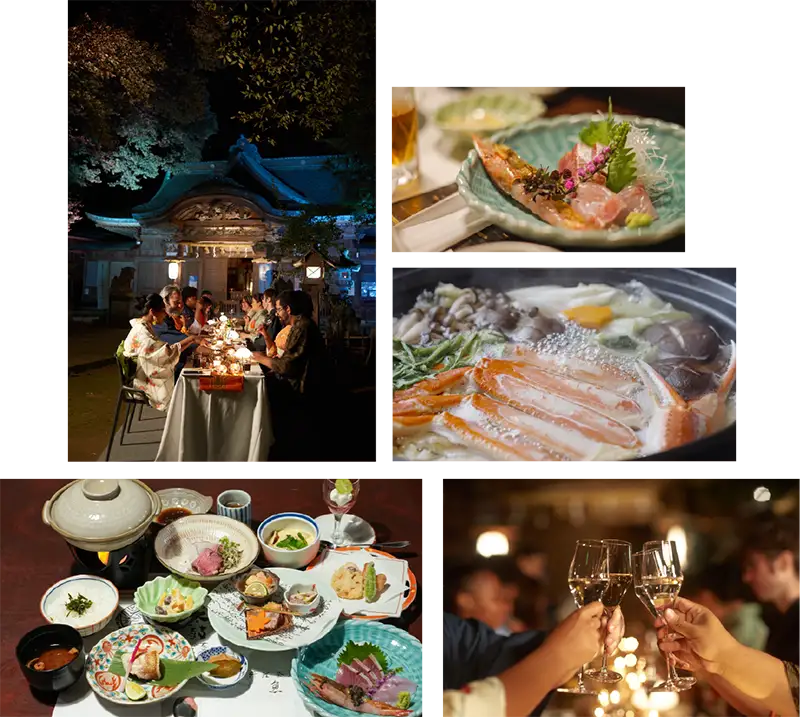 クルーズ船に乗り、海から三国湊の町並みや東尋坊からの眺め。三国祭の山車蔵を巡り、旧岸名家等の歴史的な建物内が立ち並びます。町内では、茶や和菓子、三味線鑑賞、盆栽づくり、提灯づくりなども楽しめます。三國神社では、貸切にて「特別祈祷」を通常非公開エリアにて行います。雅楽・神事、心づくしの特別ディナー、町家ホテルからの早朝散策。11月以降は旬の越前がにを味わうこともできます。