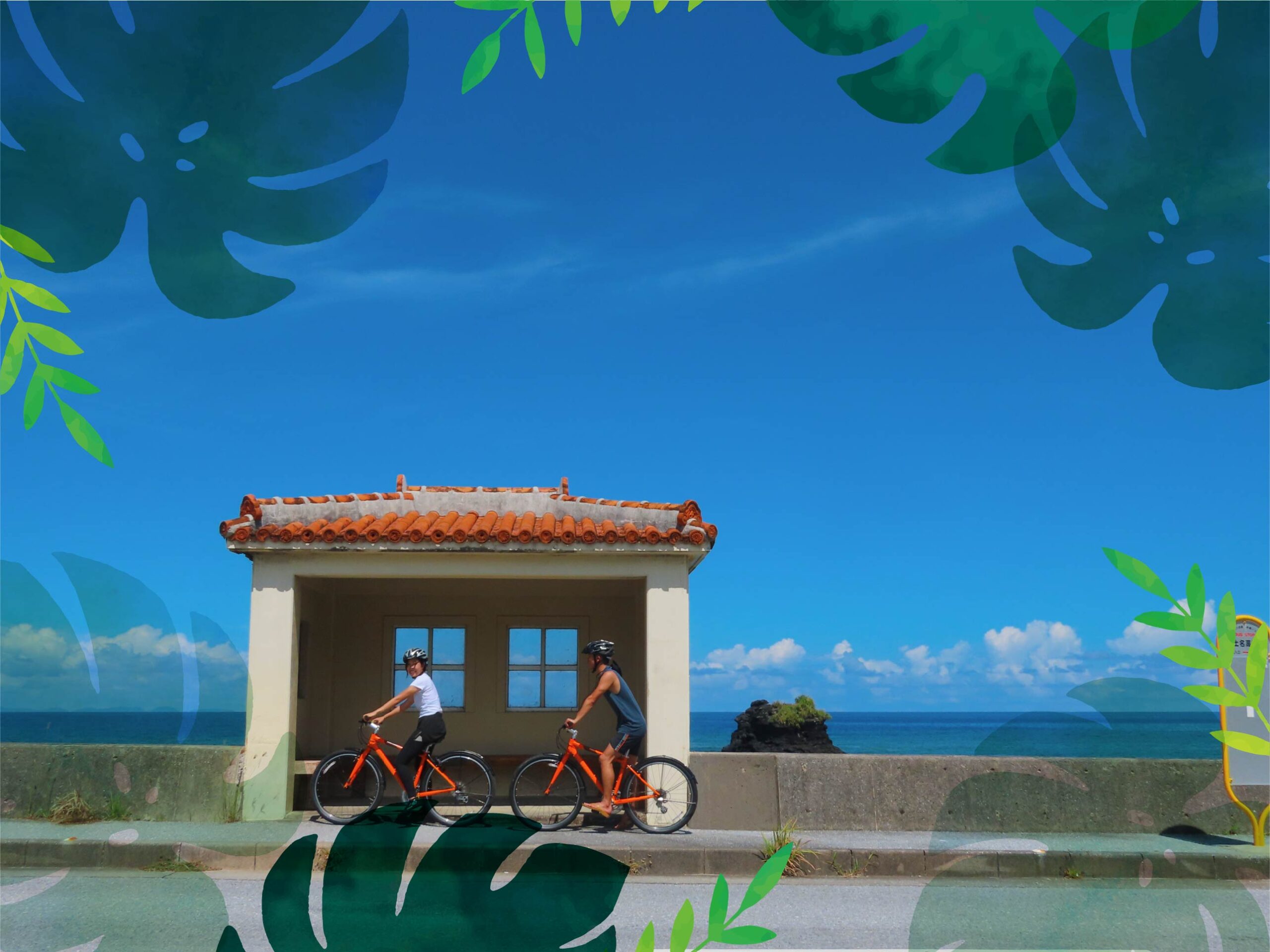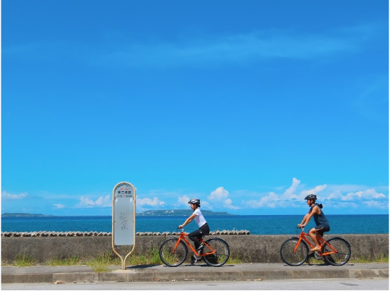 サイクリングのレクチャーを受けたあと、いよいよ海沿いの道へ。目の前にはどこまでも続く青い海と空が広がります。潮風が頬をなで、波の音が心地よく響く中、電動自転車で無理なく爽快にクルージング。やんばるの開放感を全身で味わえる、旅のはじまりです。