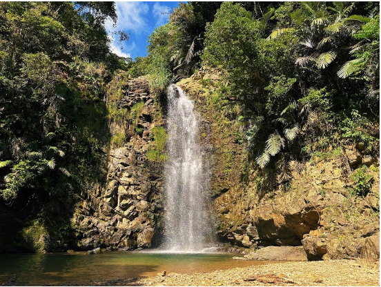 海辺を走ったあとは、やんばるの森へ。落差のある水の流れと静かな滝つぼが広がり、やんばるならではの雄大な自然を感じられます。