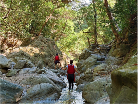 やんばるの森の中を、川の流れに沿ってゆっくり沢歩き。木漏れ日と清流の音に癒されながら、滝を目指して進む時間も特別な体験です。