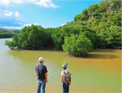 森からマングローブ、そして海へ。東村の“本当の自然”を走る。電動自転車で巡る、やんばる東海岸のルート。東村ふれあいヒルギ公園から慶佐次湾のヒルギ林へと進み、川と海が混ざり合うマングローブの景色を体感します。その先には、透明度の高いウッパマビーチ。自然の中を“走り抜ける”。車では出会えない風景と空気に出会う、東海岸ならではのサイクリング体験です。